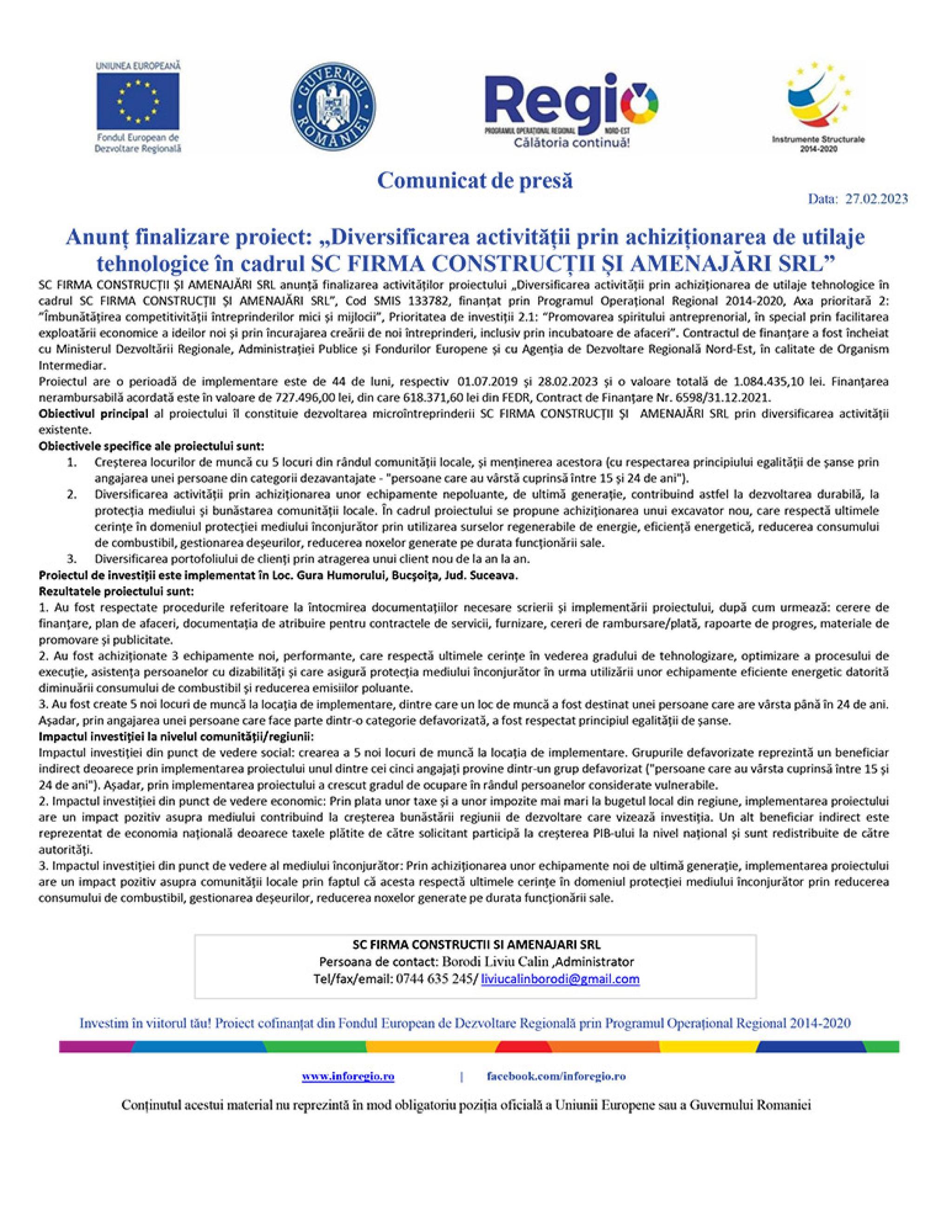 SC FIRMA CONSTRUCȚII ȘI AMENAJĂRI SRL anunță finalizarea activităților proiectului „Diversificarea activității prin achiziționarea de utilaje tehnologice în cadrul SC FIRMA CONSTRUCȚII ȘI AMENAJĂRI SRL”, Cod SMIS 133782, finanțat prin Programul Operațional Regional 2014-2020, Axa prioritară 2: ”Îmbunătățirea competitivității întreprinderilor mici și mijlocii”, Prioritatea de investiții 2.1: “Promovarea spiritului antreprenorial, în special prin facilitarea exploatării economice a ideilor noi și prin încurajarea creării de noi întreprinderi, inclusiv prin incubatoare de afaceri”. Contractul de finanțare a fost încheiat cu Ministerul Dezvoltării Regionale, Administrației Publice și Fondurilor Europene și cu Agenția de Dezvoltare Regională Nord-Est, în calitate de Organism Intermediar.