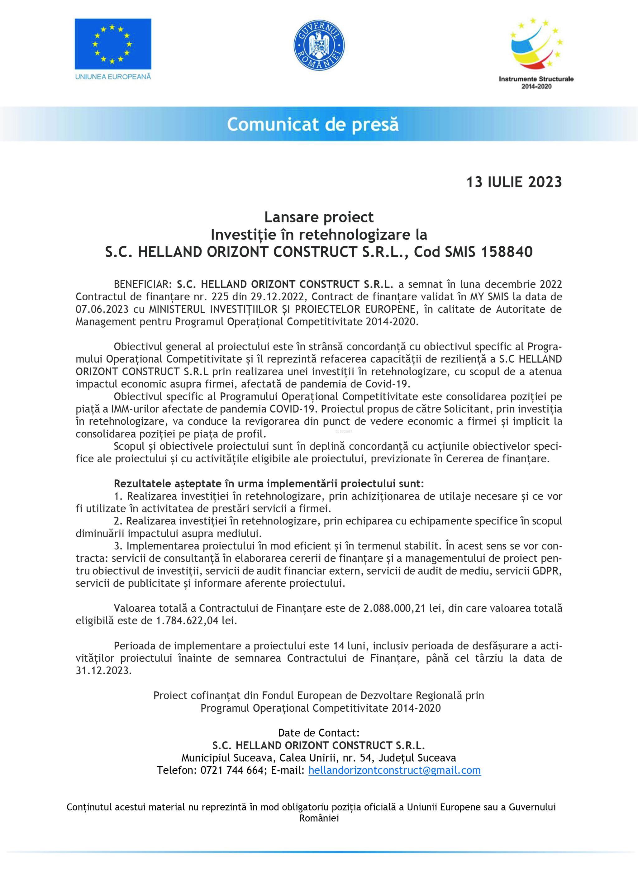 BENEFICIAR: S.C. HELLAND ORIZONT CONSTRUCT S.R.L. a semnat în luna decembrie 2022 Contractul de finanțare nr. 225 din 29.12.2022, Contract de finanțare validat în MY SMIS la data de 07.06.2023 cu MINISTERUL INVESTIȚIILOR ȘI PROIECTELOR EUROPENE, în calitate de Autoritate de Management pentru Programul Operațional Competitivitate 2014-2020.