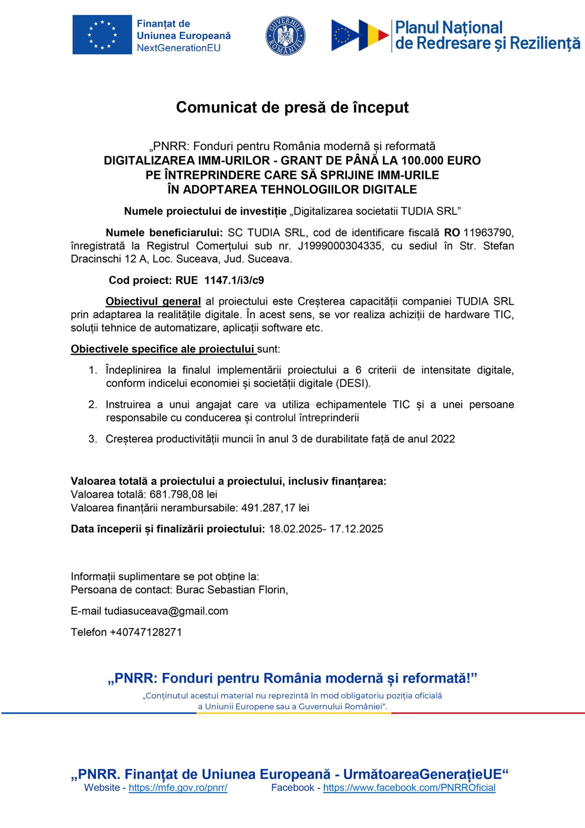 Numele beneficiarului: SC TUDIA SRL, cod de identificare fiscală RO 11963790, înregistrată la Registrul Comerțului sub nr. J1999000304335, cu sediul în Str. Stefan Dracinschi 12 A, Loc. Suceava, Jud. Suceava.