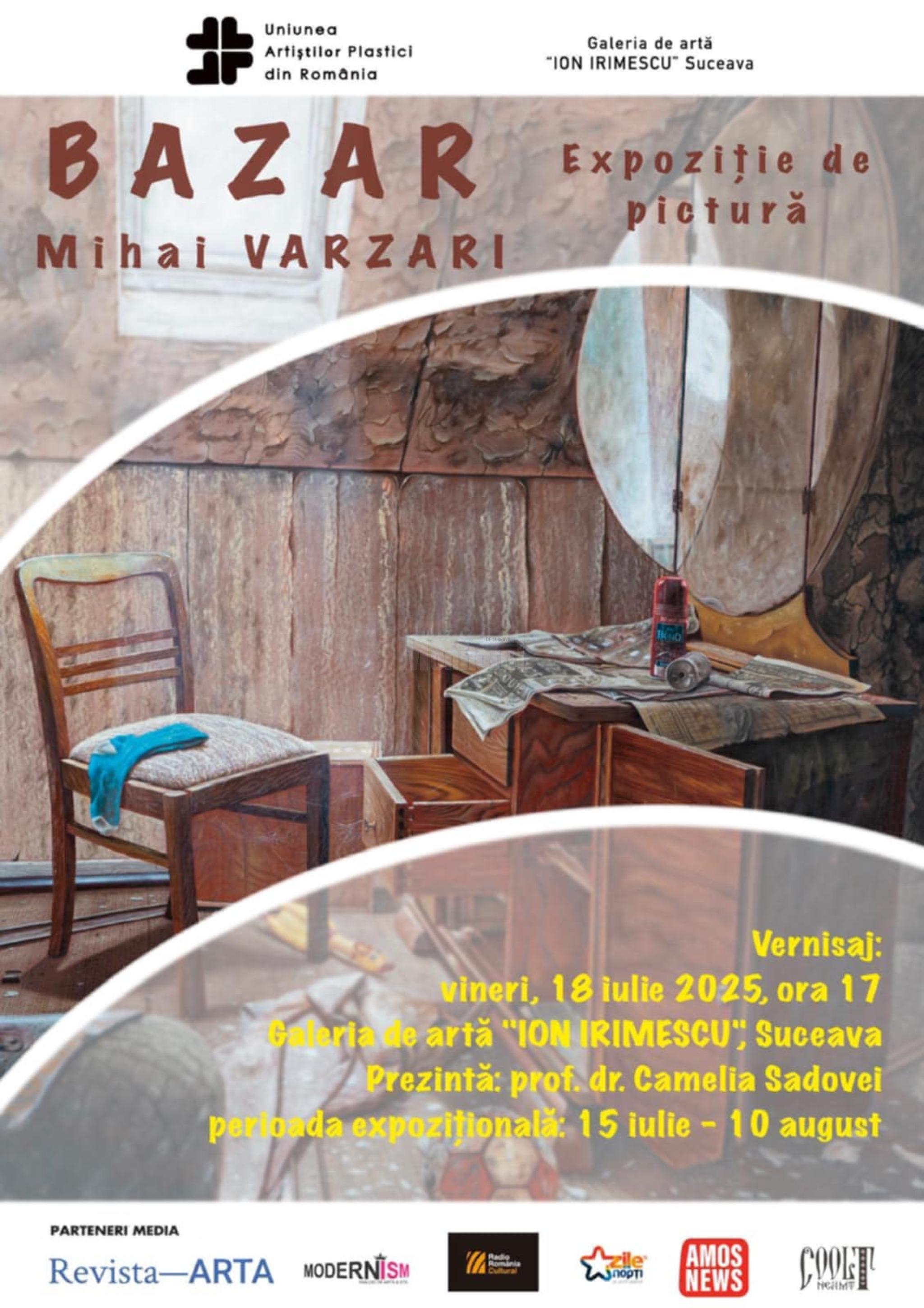 Artistul Mihai Vărzari, nou membru al Filialei sucevene a Uniunii Artiștilor Plastici din România (UAP), va expune, în perioada 15 iulie – 10 august, la Galeria de Artă „Ion Irimescu” Suceava, lucrări de pictură, sub un titlu generic, „Bazar”. Vernisajul expoziției va avea loc vineri, 18 iulie 2025, la ora 17:00. Expoziția va fi prezentată de prof. dr. Camelia Sadovei.