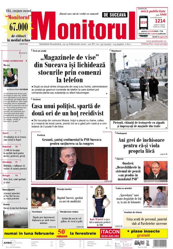 Newsletter Monitorul de Suceava RSS Monitorul de Suceava Monitorul de Suceava pe YouTube Monitorul de Suceava pe Twitter Monitorul de Suceava pe Facebook