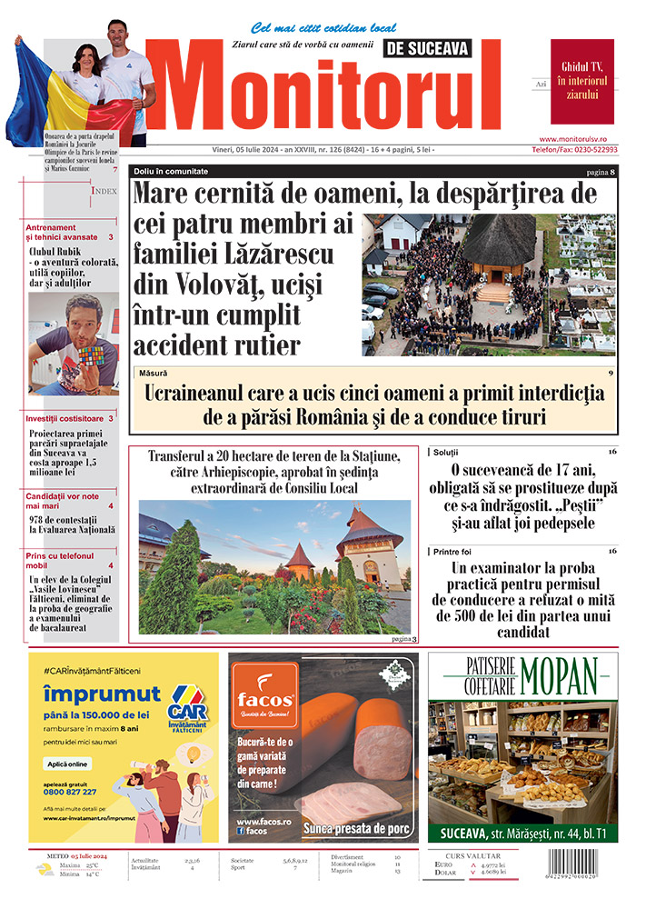 Newsletter Monitorul de Suceava RSS Monitorul de Suceava Monitorul de Suceava pe YouTube Monitorul de Suceava pe Twitter Monitorul de Suceava pe Facebook
