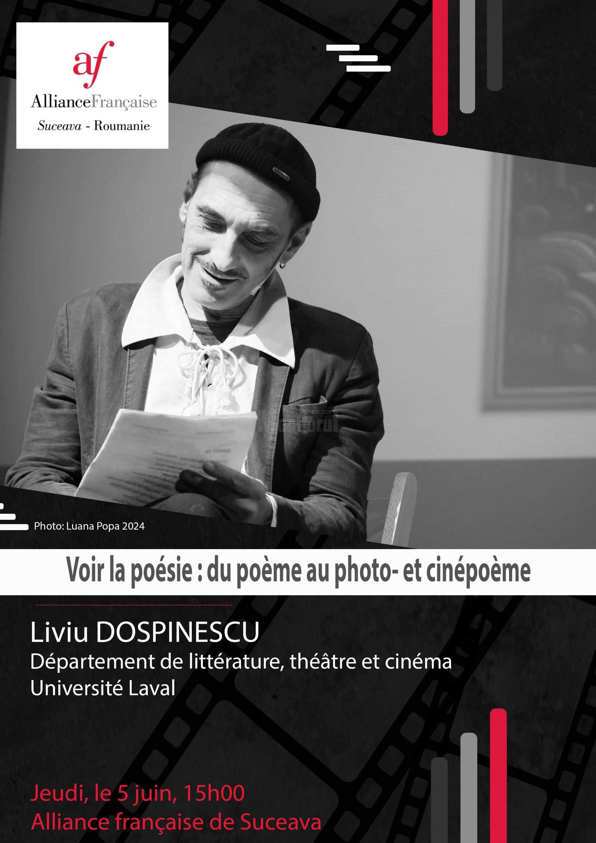 Întâlnirea din această săptămână, joi, 5 iunie 2025, ora 15.00, îl are ca invitat pe Liviu Dospinescu, profesor la Departamentul de Literatură, Teatru și Cinema al Universităţii Laval (Québec, Canada), care ne propune o reflecţie asupra poeziei sub titlul Voir la poésie : du poème au photo- et cinépoème/A vedea poezia: de la poem la foto- și cinepoem.