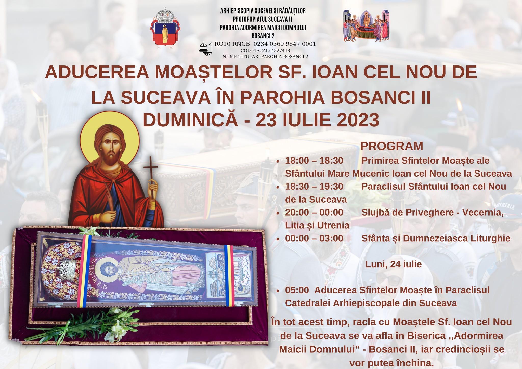 Cu binecuvântarea lui Dumnezeu și prin părinteasca purtare de grijă a Înaltpreasfințitului Calinic, Arhiepiscop al Sucevei și Rădăuților, în după amiaza zilei de duminică, 23 iulie 2023, racla care adăpostește moaștele Sfântului Mare Mucenic Ioan cel Nou de la Suceava va poposi pentru câteva ore în Biserica „Adormirea Maicii Domnului” Bosanci II, spre bucuria tuturor credincioșilor din zonă.