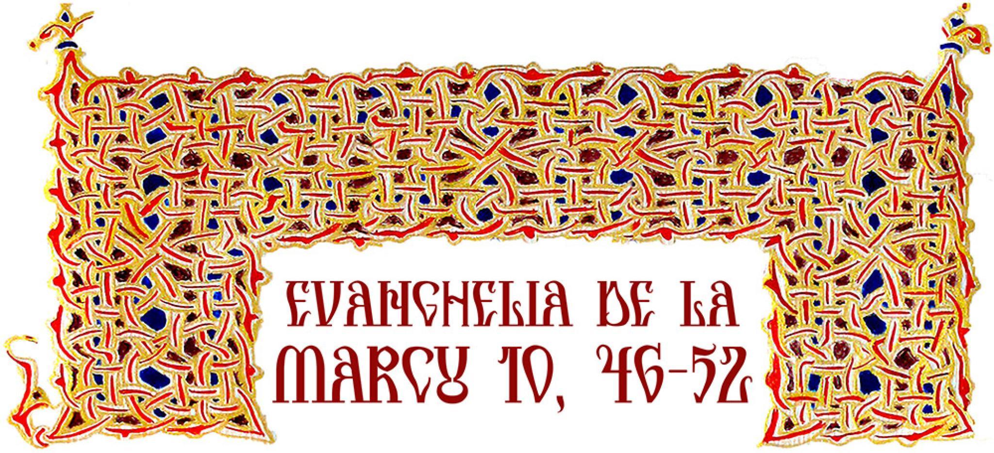 „Şi au venit în Ierihon. Şi ieşind din Ierihon Iisus, ucenicii Lui şi mulţime mare, Bartimeu orbul, fiul lui Timeu, şedea jos, pe marginea drumului. Şi, auzind că este Iisus Nazarineanul, a început să strige şi să zică: «Iisuse, Fiul lui David, miluieşte-mă!». Şi mulţi îl certau ca să tacă, el însă cu mult mai tare striga: «Fiule al lui David, miluieşte-mă!». Şi Iisus, oprindu-Se, a zis: «Chemaţi-l!». Şi l-au chemat pe orb, zicându-i: «Îndrăzneşte, scoală-te! Te cheamă». Iar orbul, lepădând haina de pe el, a sărit în picioare şi a venit la Iisus. Şi l-a întrebat Iisus, zicându-i: «Ce voieşti să-ţi fac?». Iar orbul I-a răspuns: «Învăţătorule, să văd iarăşi». Iar Iisus i-a zis: «Mergi, credinţa ta te-a mântuit». Şi îndată a văzut şi urma lui Iisus pe cale.”