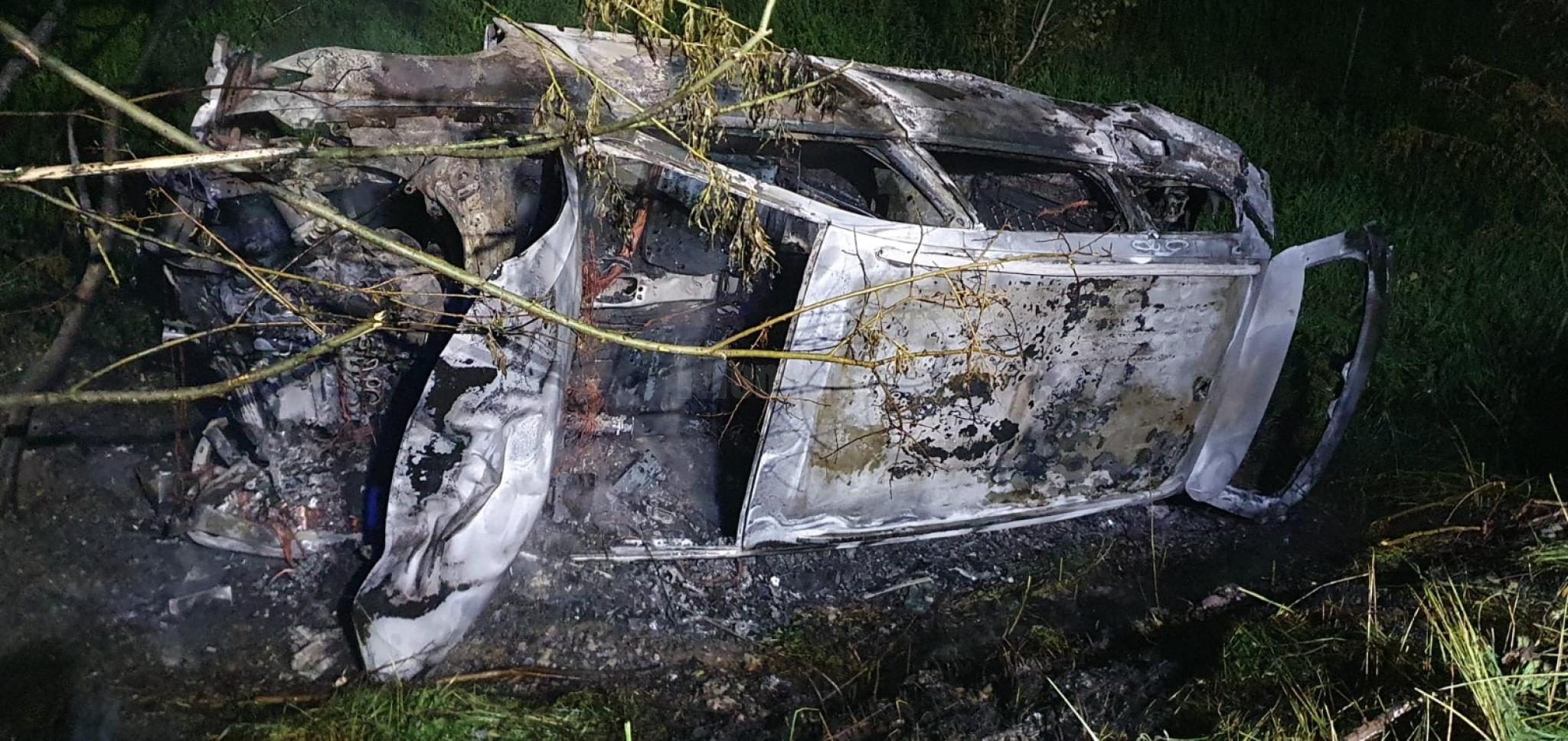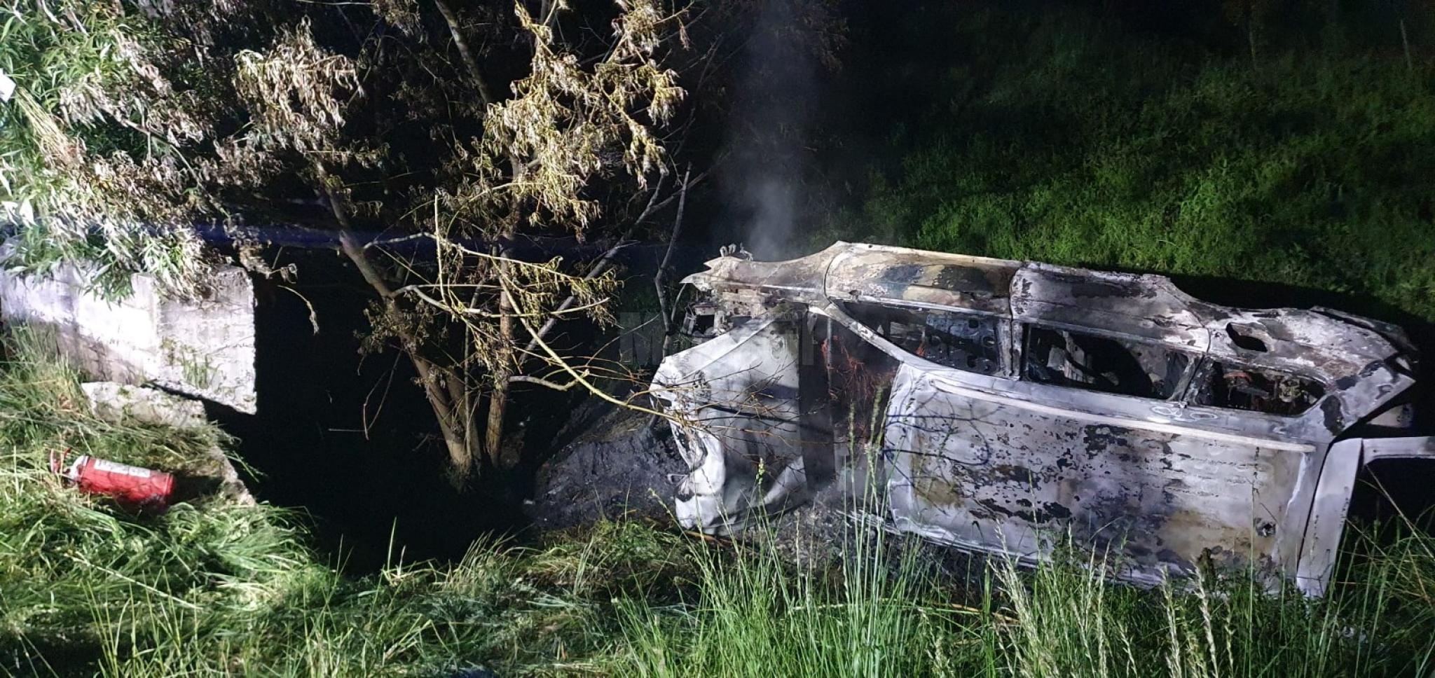 O mașină care a lovit un cap de pod s-a răsturnat, iar ulterior a luat foc și a ars în totalitate.