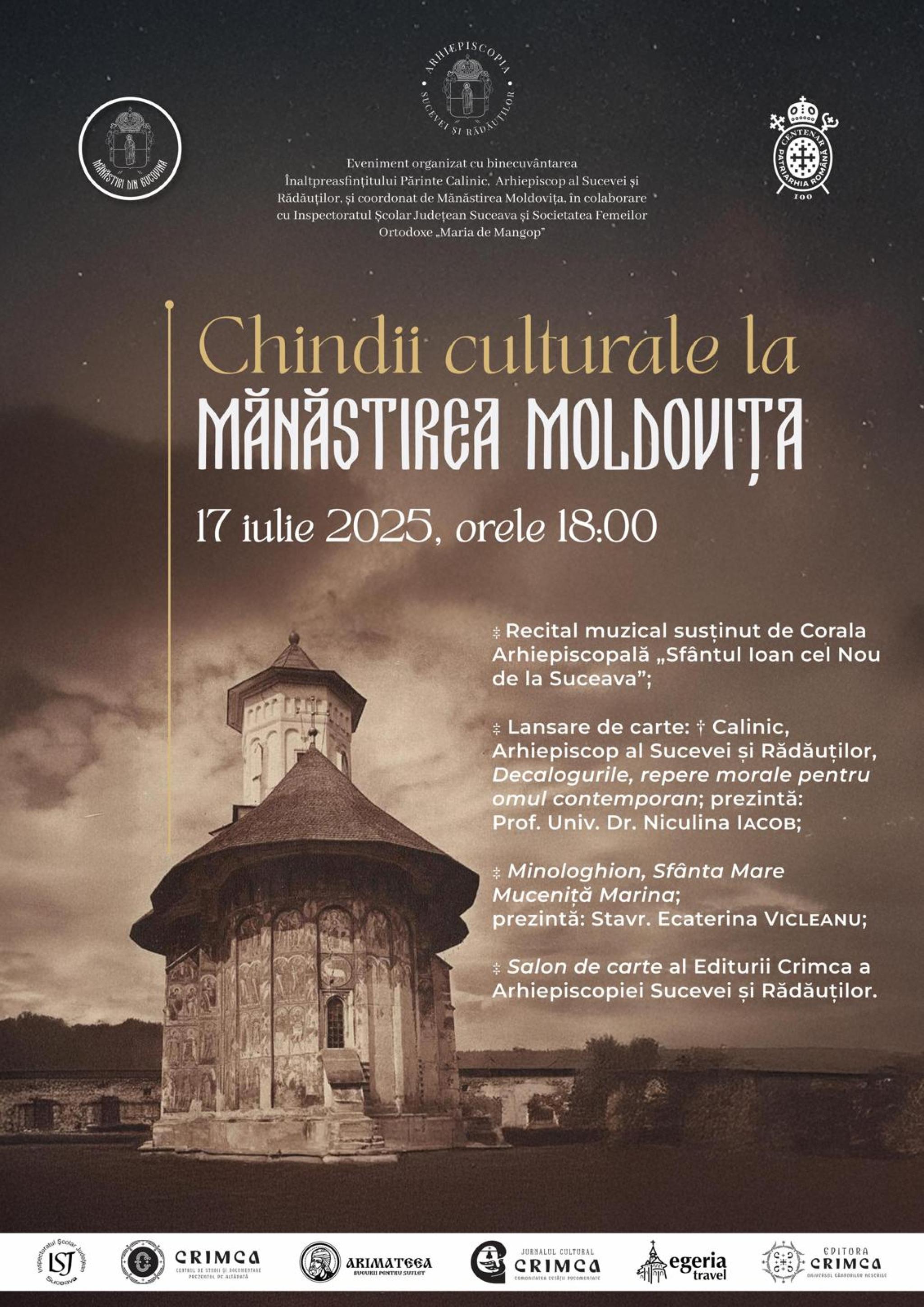 În aceeași zi, din programul Chindiei culturale: lansarea cărții „Decalogurile, repere morale pentru omul contemporan”, semnată de Înaltpreasfințitul Părinte Calinic, Arhiepiscop al Sucevei și Rădăuților, recenzie realizată de prof. univ. dr. Niculina Iacob, Facultatea de Litere şi Ştiinţe ale Comunicării, Universitatea „Ştefan cel Mare” Suceava; Minologhion, Sfânta Mare Muceniță Marina, susținut de stavrofora Ecaterina Vicleanu, stareța Mănăstirii Moldovița; Salon de carte al Editurii Crimca a Arhiepiscopiei Sucevei și Rădăuților.