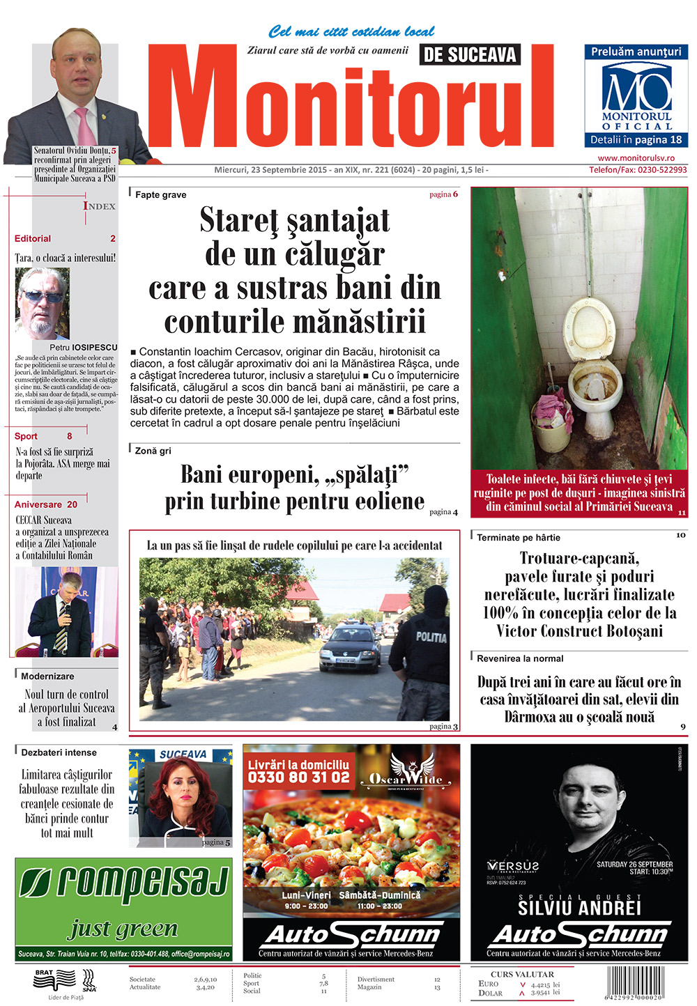 Newsletter Monitorul de Suceava RSS Monitorul de Suceava Monitorul de Suceava pe YouTube Monitorul de Suceava pe Twitter Monitorul de Suceava pe Facebook