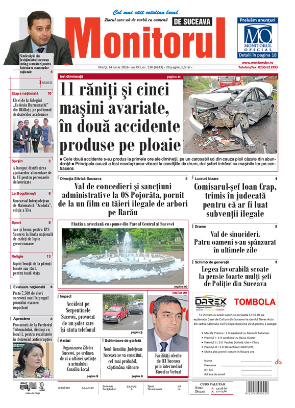 VIDEOFOTOAccident pe Serpentinele Sucevei, provocat de un şofer care îşi căuta telefonulBalul Bobocilor de la Colegiul Naţional “Mihai Eminescu”