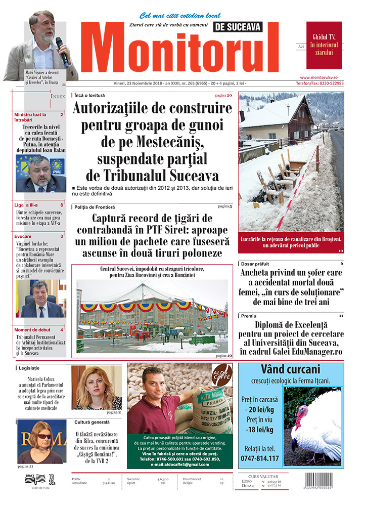 | Centrul Sucevei, împodobit cu steaguri tricolore, pentru Ziua Bucovinei și cea a României |