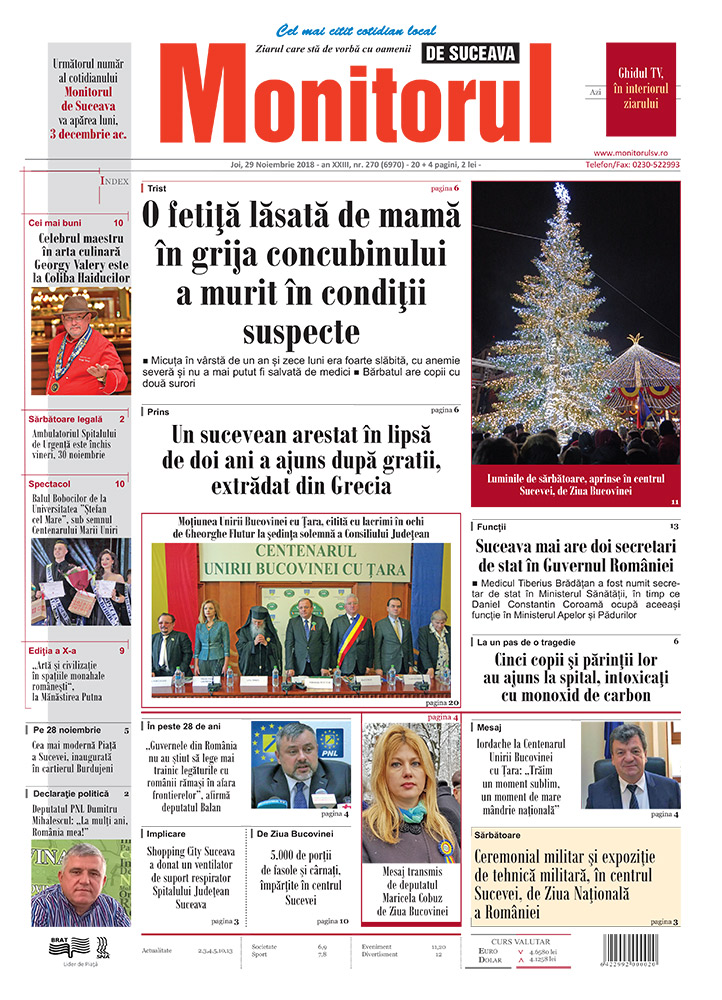 | Luminile de sărbătoare, aprinse în centrul Sucevei, de Ziua Bucovinei |
