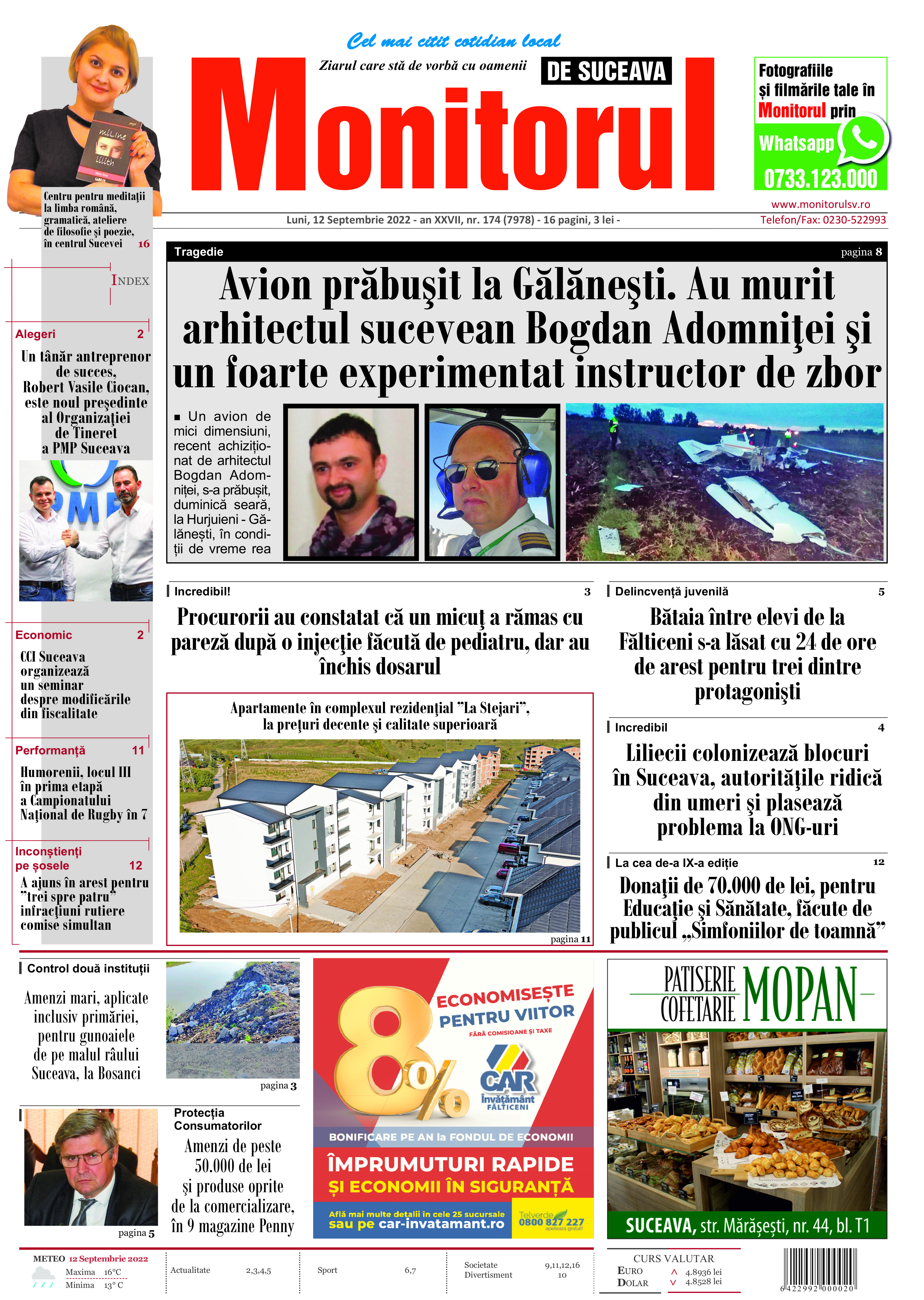 | Avion prăbușit la Gălănești. Au murit arhitectul sucevean Bogdan Adomniței și un foarte experimentat instructor de zbor |
