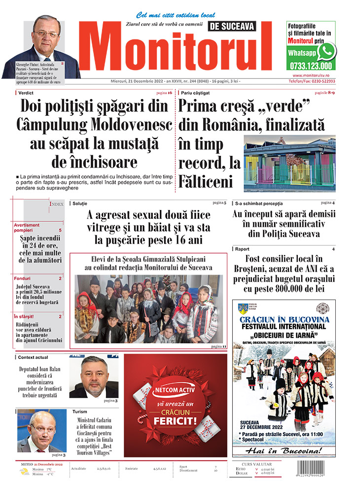 | Elevi de la Şcoala Gimnazială Stulpicani au colindat redacția Monitorului de Suceava |